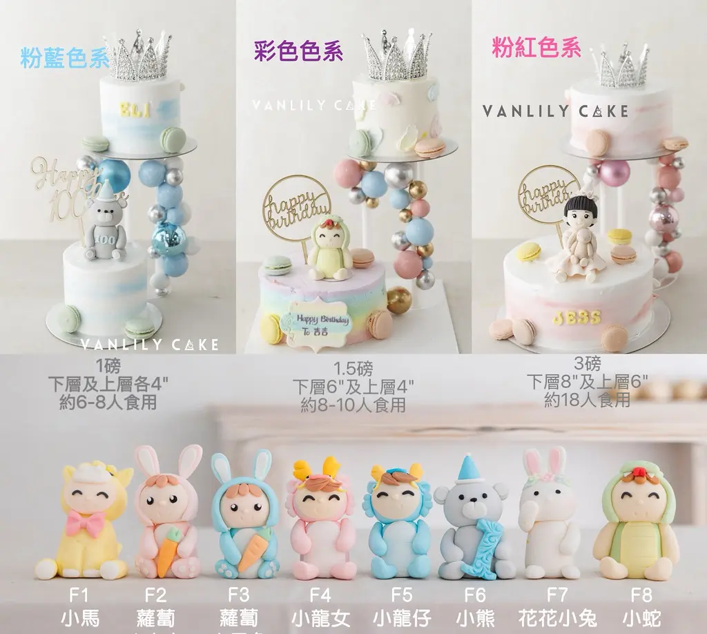 | 蛋糕公仔造型 | F1 小馬, F2 蘿蔔小女兔, F3 蘿蔔小男兔, F4 小龍女, F5 小龍仔, F6 小熊, F7 花花小兔, F8 小蛇, 來相自訂公仔 |